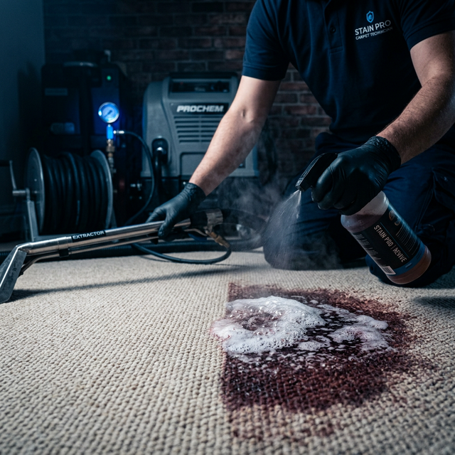 We apply specialized cleaning agents matched to stain chemistry. Protein stains receive enzymatic treatments containing bacteria that digest organic compounds. Tannin-based stains get alkaline solutions that break down color molecules. Oil-based stains require solvent degreasers that dissolve lipids. Each pre-treatment includes appropriate dwell time (5-20 minutes) allowing chemical reactions to complete before extraction.